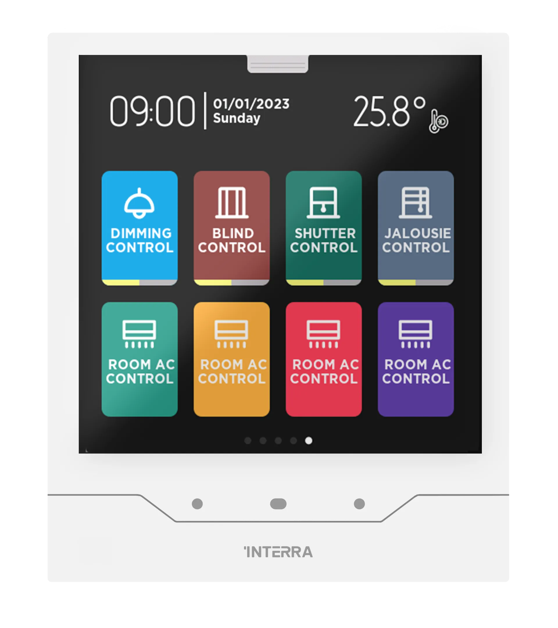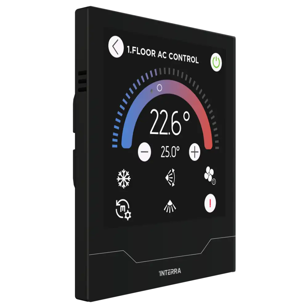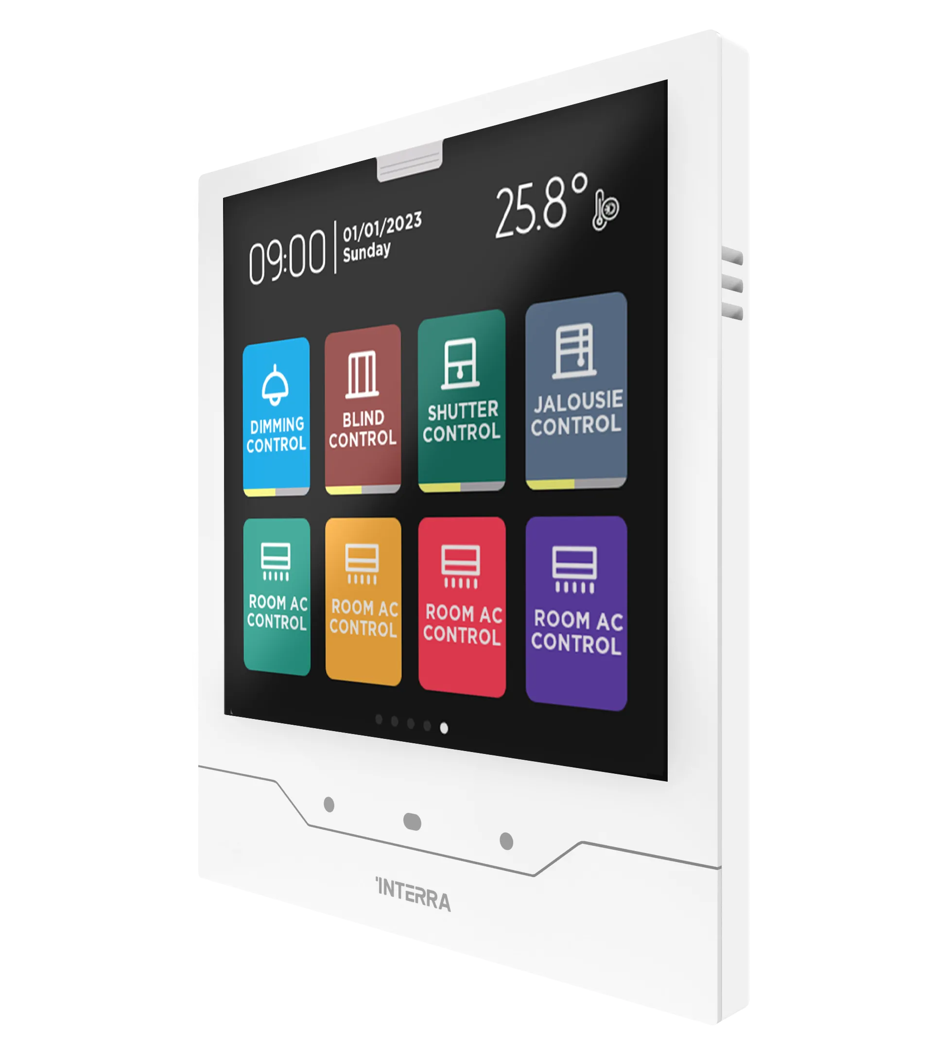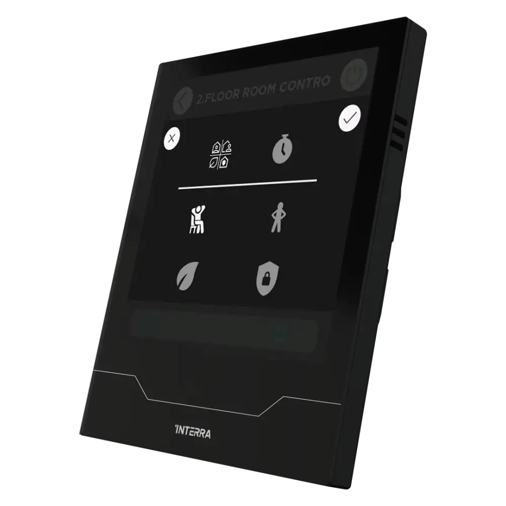 El Interra iX4 + AQI es un panel táctil KNX compacto de 4″ diseñado para ofrecer un control avanzado de estancias en viviendas, hoteles y edificios inteligentes. Su pantalla IPS de alta respuesta, combinada con una interfaz completamente configurable (1×2, 1×4, 2×4), permite acceder de forma intuitiva a todas las funciones de automatización.